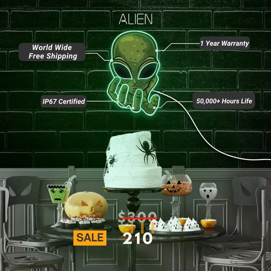 Experience a surreal ambiance in your space with Alien UV Green Light by LEDNeons. This Sign Crafted to mesmerize, this unique light source combines the mysterious allure of extraterrestrial energy with a modern design twist.