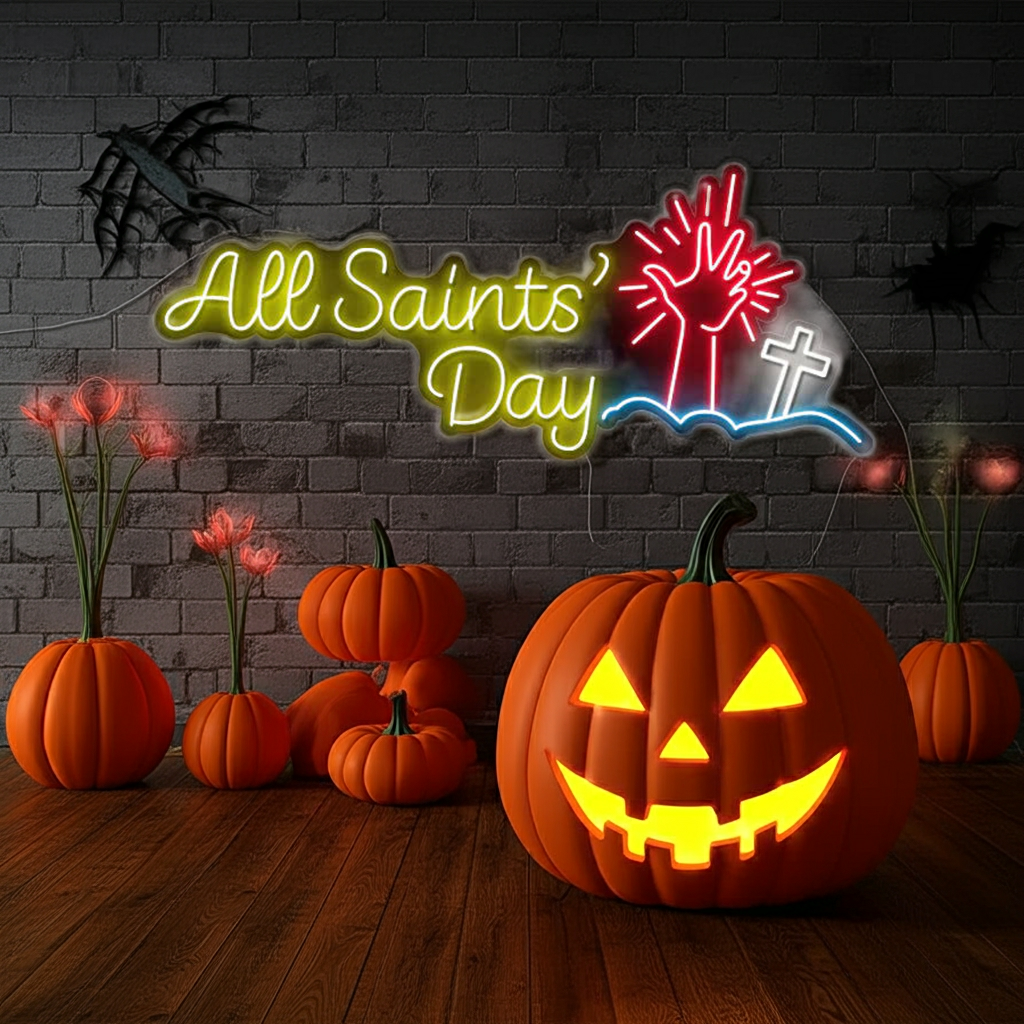 Light up your festive Season with the All Saints Day Halloween LED Neon Sign by LEDNeons. This Sign Blending reflect with a touch of spooky style, Crafted with energy-efficient LED tubing and a durable acrylic backboard, it’s lightweight, safe, and easy to mount ideal for indoor use or protected outdoor setups.