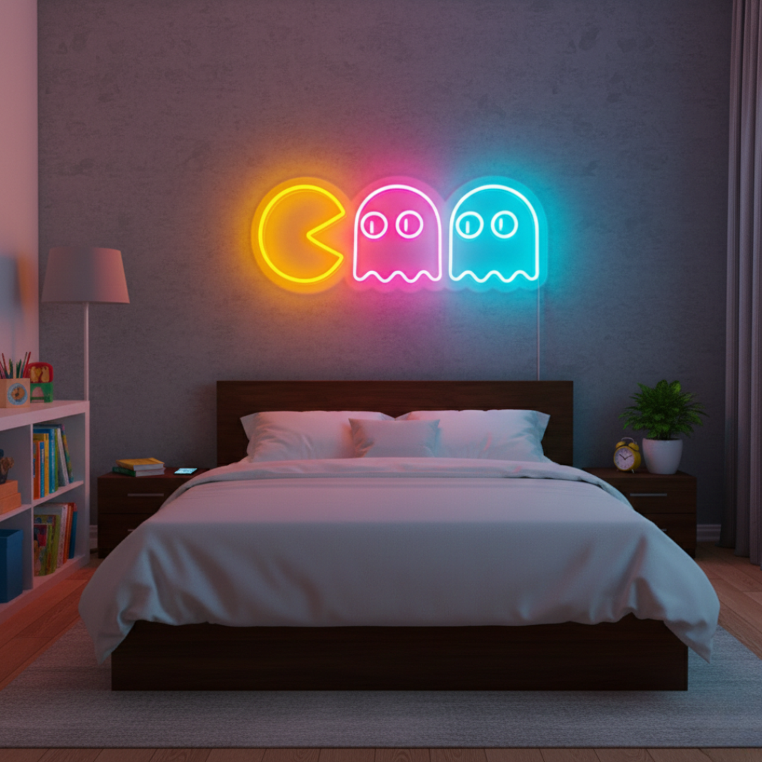 Bring classic arcade nostalgia to life with the Pac-Man Chasing Ghosts LED Neon Sign by LEDNeons.  This vibrant and playful design captures the iconic scene of Pac-Man pursuing the colorful ghosts, illuminated in bright neon hues that instantly energize any space.