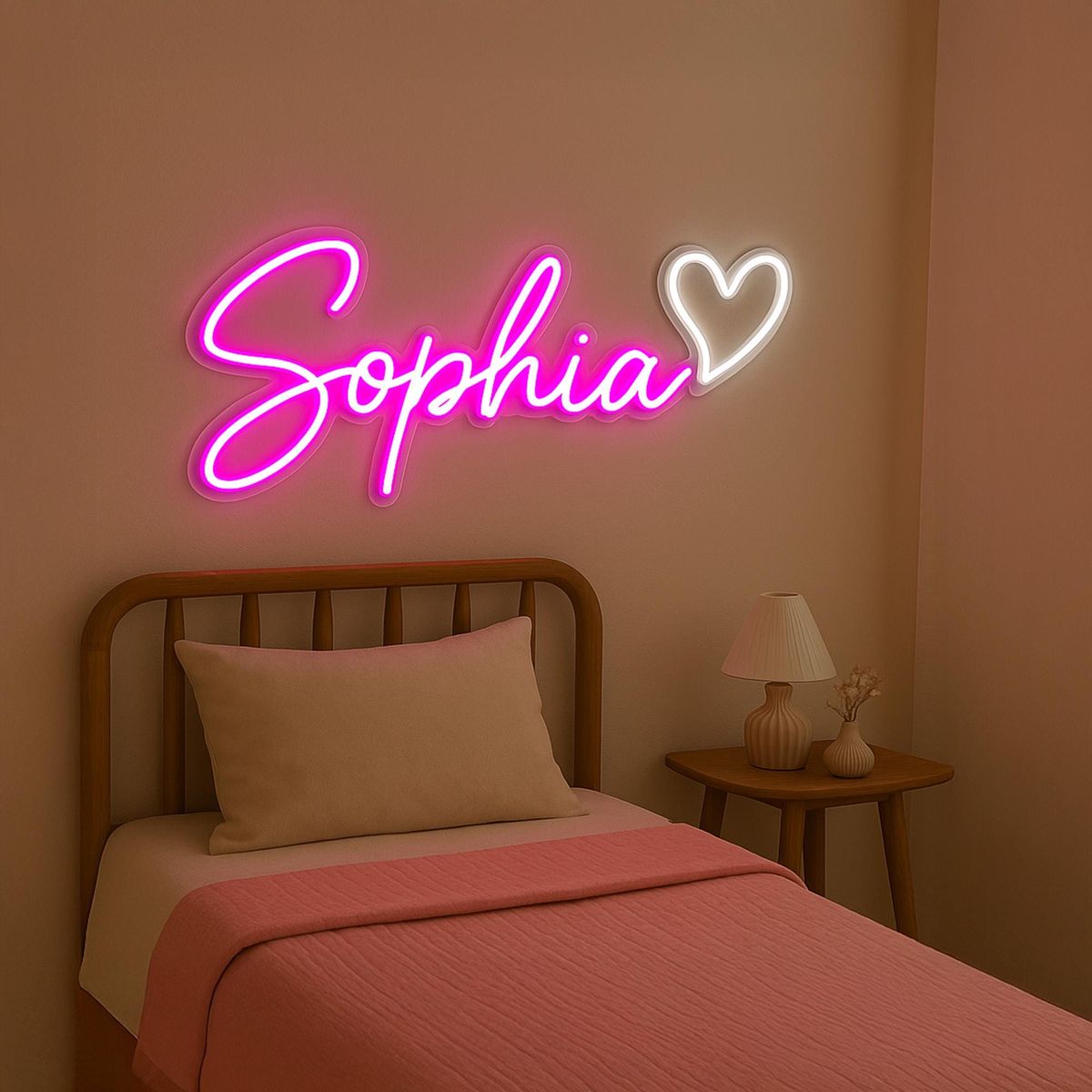 This sign Designed with elegant script and a soft, luminous glow, this custom sign brings charm and warmth to bedrooms, nurseries, events, or photo backdrops. Whether it’s a gift or a decor upgrade, the "Sophia" neon sign is a stylish way to showcase personality and brighten up any space.
